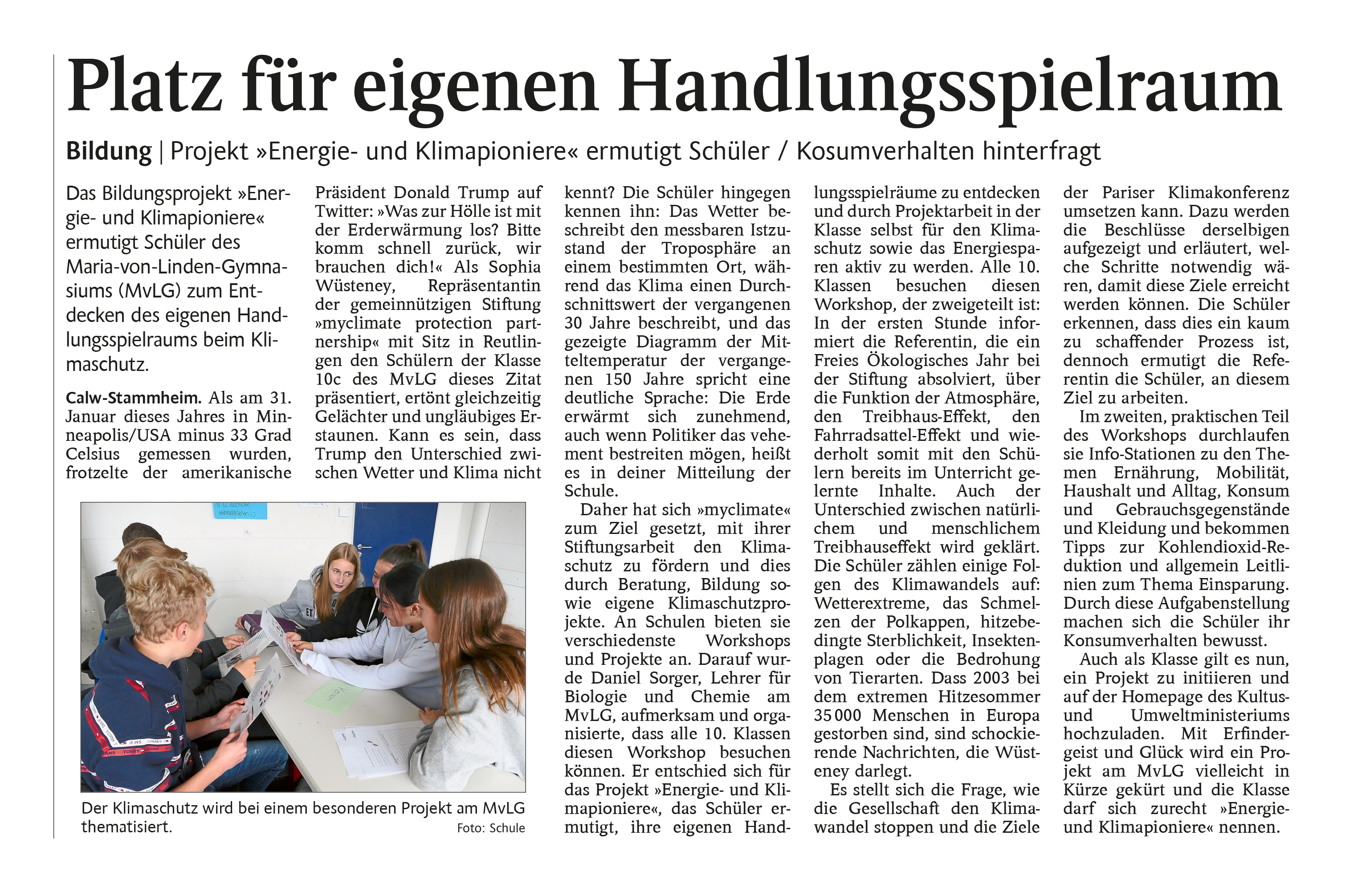 Die gemeinnützige Klimaschutzorganisation myclimate Deutschland war zu Besuch am Maria-von-Linden-Gymnasium in Calw-Stammheim. Dort hat myclimate-Mitarbeiterin Sophia Wüsteney den Schüler im Rahmen des Projekts "Energie- und Klimapioniere" praxisnah aufgezeigt, was jeder Einzelne gegen den Klimawandel tun kann und sie ermutigt selbst aktiv zu werden. Der Schwarzwälder Bote war mit im Klassenzimmer vor Ort und hat darüber berichtet: