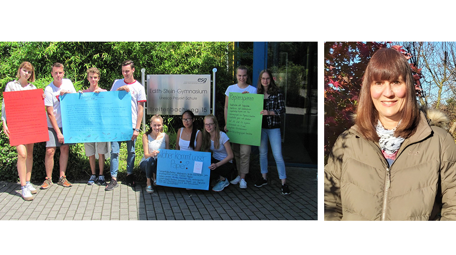 Petra Wigand: Die Schülerinnen und Schüler der 10c begannen zunächst im Kleinen damit, Lösungen für die Altpapiersammlung an unserer Schule zu entwickeln – es war ohnehin ein aktuelles Thema. Danach haben sie die komplette Schule auf den Prüfstand gestellt und gemeinsam ein ganzes Nachhaltigkeitskonzept für die kommenden Schuljahre entwickelt, das an schon Vorhandenes anknüpft, in den letzten Schuljahren Vernachlässigtes wieder aufgreift und dazu weitere neue Ideen hervorgebracht hat. ...