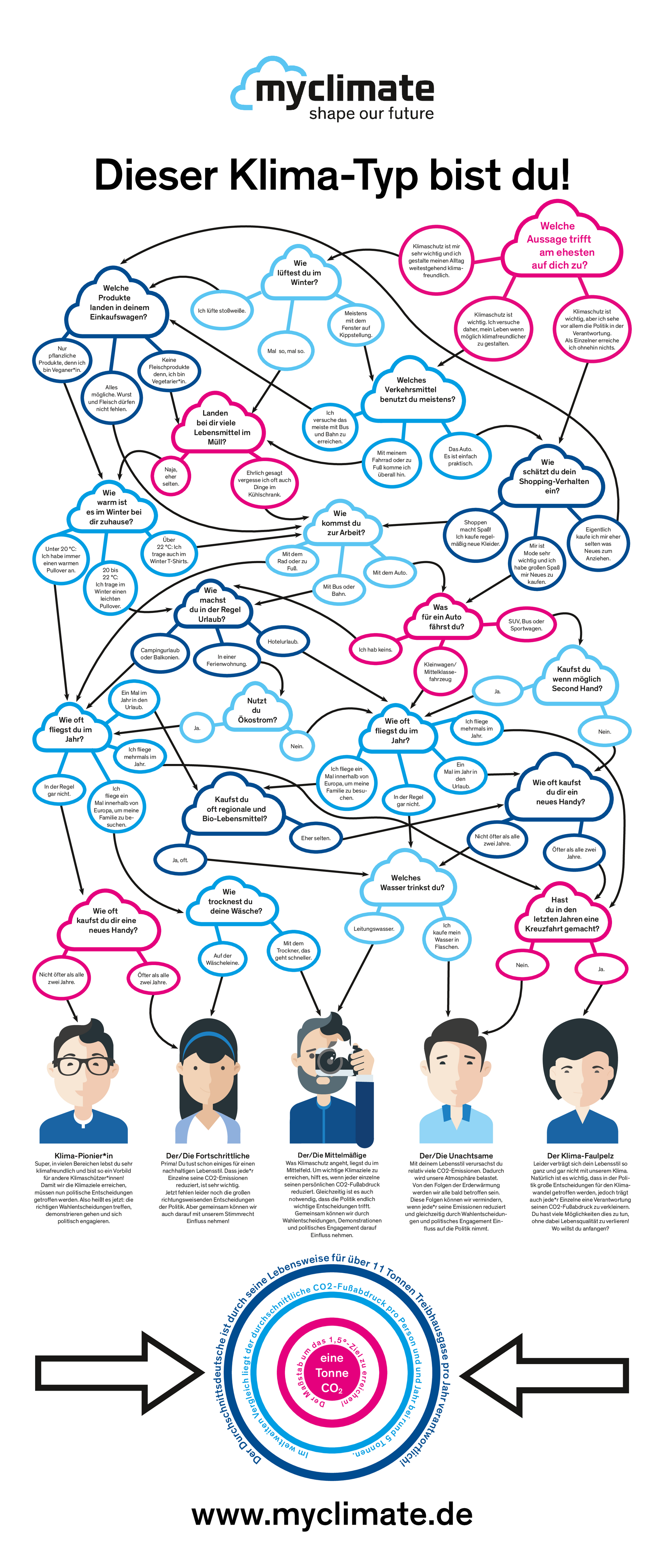 Anhand verschiedener Faktoren wie beispielsweise des persönlichen Shopping-Verhaltens, der Wahl des täglichen Verkehrsmittels, des Urlaubsziels oder der Ernährungsweise wird ermittelt, wie klimafreundlich die eigene Lebensweise ist. Das Fragen-Labyrinth führt über verschiedene Pfade zu verschiedenen Ausgängen. Was, wenn ich häufiger mit Bus und Bahn zur Arbeit fahre, meine Wäsche auf der Leine trockne oder ab sofort nur noch Leitungswasser trinke? Du hast die Wahl!